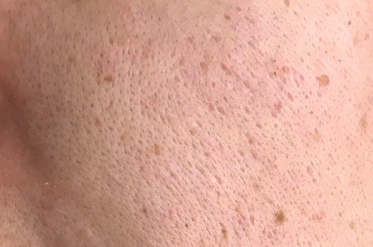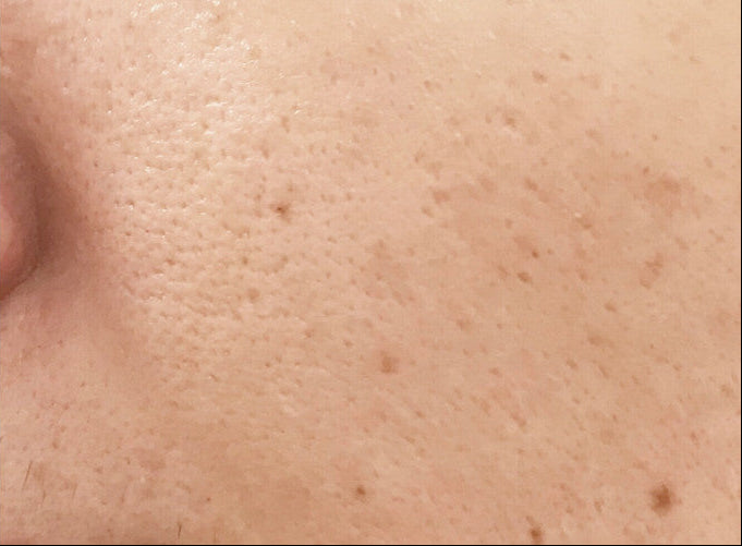 Skin Appearance: Enlarged pores, visible discoloration, and uneven skin texture. The skin shows more pronounced spots and a rougher surface.
